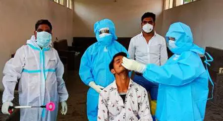 आमेट । सामुदायिक स्वास्थ्य केंद्र आमेट के मुख्य चिकित्सा अधिकारी डां.सीपी सुर्या के निर्देशन मे सोमवार को नगर के सामुदायिक स्वास्थ्य केंद्र पर बनाये गए कोविड 19 जांच केंद्र पर एक दिन में रिकार्ड 124 संदिग्ध लोगो की कोरोना सेंपलिंग ली गई। मुख्य ब्लांक चिकित्सा अधिकारी डां. सीपी सुर्या ने बताया की विगत 3 दिनों में आमेट ब्लॉक में करीब 21 कोरोना पॉजिटिव मरीजो के आने बाद सोमवार को गुजरात व महाराष्ट्र से आए अनेक प्रवासियों ने अपनी कोरोना सैंपलिंग करवाई साथ ही आसपास के ग्रामीण इलाकों से भी लोगों ने जागरूकता दिखाते हुए अपने स्वास्थ्य सुरक्षा हेतु कोरोना सेंपलिंग जांच करवाई। सैंपलिंग करवाने हेतु अलसुबह से ही लोग जांच के लिए सामुदायिक स्वास्थ्य केंद्र पर सोशल डिस्टेंसिंग रखते हुए अपने बायोडाटा के साथ में खड़े दिखाई दिए।