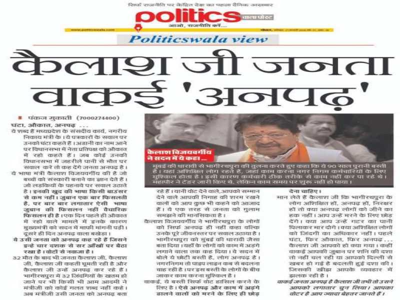 मान लेते हैं कैलाश जी कि भागीरथपुरा के लोग अशिक्षित हों, अनपढ़ हों, निरक्षर हों तो क्या अनपढ़ लोगों को जीने का हक नहीं। आप उन्हें मरने के लिए छोड़ देंगे। क्या आप उन्हें गटर का पानी पिलाकर मार दोगे। क्या अशिक्षित लोगों को जिंदगी का अधिकार नहीं। पहले घंटा, फिर औकात, फिर अनपढ़... कैलाश जी आपको हो क्या गया। कहीं वाकई आपकी जुबान पर शनि की दशा तो नहीं चल रही या आपको दिल्ली से खबर हो गई है बदलती हुई दशा की। जिसकी खीझ आपके व्यवहार में झलक रही है। वाकई जनता अनपढ़ है कैलाश जी तभी तो उसने आपको लगातार चुन लिया। आपका वोटर है आप ज्यादा बेहतर जानते हैं।