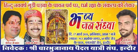इंदौर। श्री चारभुजानाथ पैदल यात्री संघ इंदौर के मार्गदर्शक एवं संयोजक श्री संतोष जोशी (संटु), आयोजक श्री रोनक पुरोहित ने पालीवाल वाणी को बताया कि श्री चारभुजानाथ पैदल यात्री संघ इंदौर के तत्वाधान में प्रतिवर्षानुसार इस वर्ष भी हिंदू नववर्ष गुड़ी पड़वा के पावन पर्व पर धर्म रक्षा-राष्ट्र रक्षा के संकल्प को भजन सम्राट श्री कृष्णा गौतम, पालीवाल समाज के भजन सम्राट श्री कपिल पुरोहित भव्य भजन संध्या एवं फाग महोत्सव में अपनी स्वर लहरी से भजन गाकर धूम मचाऐगे। भव्य भजन संध्या एवं फाग महोत्सव का आयोजन आज दिनांक 18 मार्च 2018 को रात्रि 7 बजे से प्रारंभ होगा। आयोजन स्थल अशोक नगर, 60 फिट रोड, सेंट गिरी स्कुल के पीछे, साई मंदिर के आगे इंदौर, मध्यप्रदेश पर आयोजित किया जा रहा है। जिसमे आप सभी सपरिवार व अपने इष्टमित्रों सहित सादर आमंत्रित है।