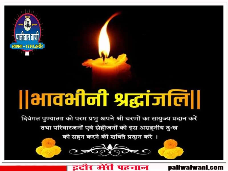 इंदौर. अत्यंत दुःख के साथ सूचित करने मे आता है की पालीवाल ब्राह्मण समाज 44 श्रेणी की कुमारी खुशबू पिता देवकृष्ण दवे (देवा)(ग्राम. खनोटा/ब्राह्मण टुकडा) का आज दिनांक 24 अक्टूबर 2025 शुक्रवार को दुखद निधन हो गया हैं. जिनकी अंतिम यात्रा दिनांक 24 अक्टूबर 2025 शुक्रवार को शाम 4:00 बजे निज निवास 40 शांति नाथ पूरी, हवा बंगला साई बाबा मंदिर के पीछे, रंजीत डेरी के सामने वाली गली, इंदौर से रामबाग मुक्तिधाम जावेगी.