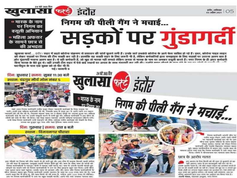 इंदौर । (मनोज जोशी) निगम के 40 से 50 कर्मचारियों ने खुलासा फर्स्ट अखबार के कार्यालय में जबरन घुसकर की तोड़फोड, स्टाफ से की मारपीट खुलासा फर्स्ट, इंदौर के समर्थन में एक फिर इंदौर वासियों ने दिखाया साहस और निगम के कामों पर प्रश्नचिंह लगाते हुए पुछ रहे कि क्या हमने इंदौर को नंबर वन इसलिए बनाया था कि जबारिया टैक्स का भार भोली भाली जनत को सहन करना पड़े जब इंदौर की आवाज मीडिया के साथ जनप्रतिधियों ने एक स्वर में निगम अफसरों मुंसबे ध्वस्त किए उसके बाद यकायक जनता पर मास्क के नाम पर पीली गाड़ी में बैठ निगम कर्मचारी मास्क के नाम पर गुंडागिर्दी पर उतार आए...जब उससे भी मन नहीं भरा तो इंदौर की आवाज बनकर खुलासा फर्स्ट इंदौर वासियों के विरोध को सरकार तक पहुंचने का प्रयास किया गया तो लोकतंत्र के चौथे स्तंभ खुलासा फर्स्ट अखबार के कार्यालय पर जबरन घुसकर लाखों रूपए की क्षति करते हुए कई कर्मचारियों के साथ मारपीट की गई। विधायक श्री संजय शुक्ला एक फिर खुलकर मीडिया का साथ देते हुए लोकतत्र के चौथे स्तंभ पर हमले की कड़े शब्दों में निंदा की।