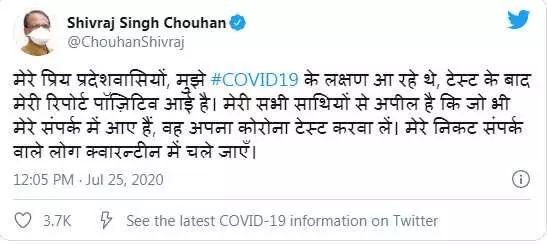 भोपाल| मध्यप्रदेश में भी कोरोना वायरस के नए नए केस सामने आ रहे हैं| आम से लेकर खास तक हर व्यक्ति इस भीषण महामारी की चपेट में आ रहा है| उधर शिवराज सिंह चौहान ने ट्वीट कर सबको अपने कोरोना पॉज़िटिव होने की खबर दी है, साथ ही अपने संपर्क मे आए सभी साथी से एहतियात के तौर पर सावधानी रख होम क्वारंटाइन रहने की सलाह दी है|