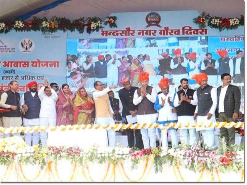 मुख्यमंत्री श्री शिवराज सिंह चौहान ने आज मंदसौर के गौरव दिवस पर 1512 करोड़ रूपये के निर्माण कार्यों का भूमि-पूजन और 10 करोड़ के कार्यों का लोकार्पण किया। प्रधानमंत्री आवास योजना शहरी के हितग्राहियों के खाते में आवास निर्माण के लिए 400 करोड़ रूपये की किश्त का सिंगल क्लिक से अंतरण किया। साथ ही इसी योजना में 50 हजार हितग्राहियों को गृह प्रवेश और 51 हजार हितग्राहियों के आवासों का भूमि-पूजन किया। मुख्यमंत्री ने आवास योजना के 5 हितग्राहियों को उनके आवास की चाबी सौंपी।