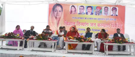 राजसमंद। दिव्यांगजन कल्याण शिविर में उपस्थित लाभार्थियों को उपकरण प्रदान करते अतिथि। फोटो-सुरेश भाट