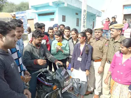 राजसमंद। श्री नाथ जी इंस्टिट्युट ऑफ बायोटेक्नोलाजी एण्ड मैनेजमेंट की एनएसएस ईकाई द्वारा खमनोर पंचायत समिति के सेमा गांव में चल रहे आवासीय शिविर के चौथें दिन सडक सुरक्षा पर अटल सेवा केन्द्र मे कार्यशाला का आयोजन रखा गया। कार्यक्रम के मुख्य अतिथी खमनोर थानाधिकारी पेशावर खान थे। अध्यक्षता सरपंच मनुदेवी गायरी ने की। प्राचार्या डॉ.दीप्ति भार्गव ने पालीवाल वाणी को बताया कि कार्यक्रम में एनएसएस स्वयंसेवको, ग्रामवासियों व मॉडल विद्यालय के बच्चो ने भाग लिया। मुख्य अतिथी खान ने अपने सम्बोंधन में यातायत नियम, पुलिस के अधिकार, सडक़ दुर्घटना के प्रमुख कारण, लाईसेंस की महत्वता, हेलमेंट उपयोग, सीटबेल्ट उपयोग, वाहन बीमा की जरूरत, सजा व जुर्माना, गति सीमा जेब्रा लाईन इत्यादि बिदुओ पर सभी को जागरूक किया। उन्होने ये भी आहवान किया यातायात नियमों का पालन कर न केवल दुर्घटना से बल्कि जुर्माने से बचा जा सकता है। सेमा में बिना हेलमेट उपयोग कर दुपहिया वाहन चलाने वालो को पुष्प भेट कर भविष्य में हेलमेट उपयोग करने हेतु आह्रवान किया गया। धन्यवाद ज्ञापन आषुतोष डागा ने व संचालन सौरभ कपूर ने किया।